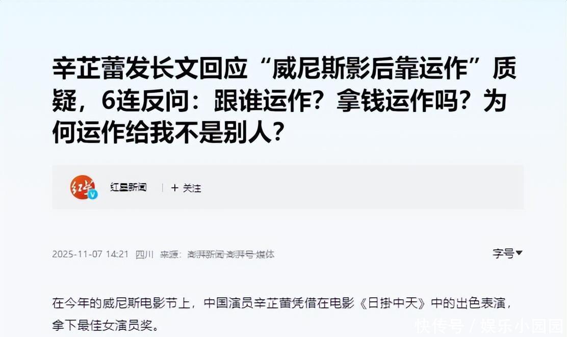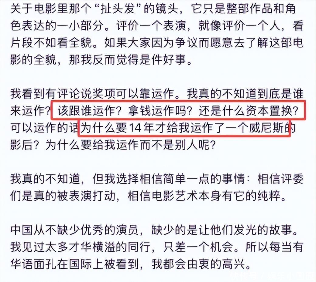这时候话在说话来,大家对辛芷蕾这个奖的含金量就心中有数了,但愿辛芷蕾真的能做到“问心无愧”的拿奖吧,其实我觉得对于辛芷蕾而言,这个奖项确实对她很重要,她也确实需要一个奖来证明自己。
